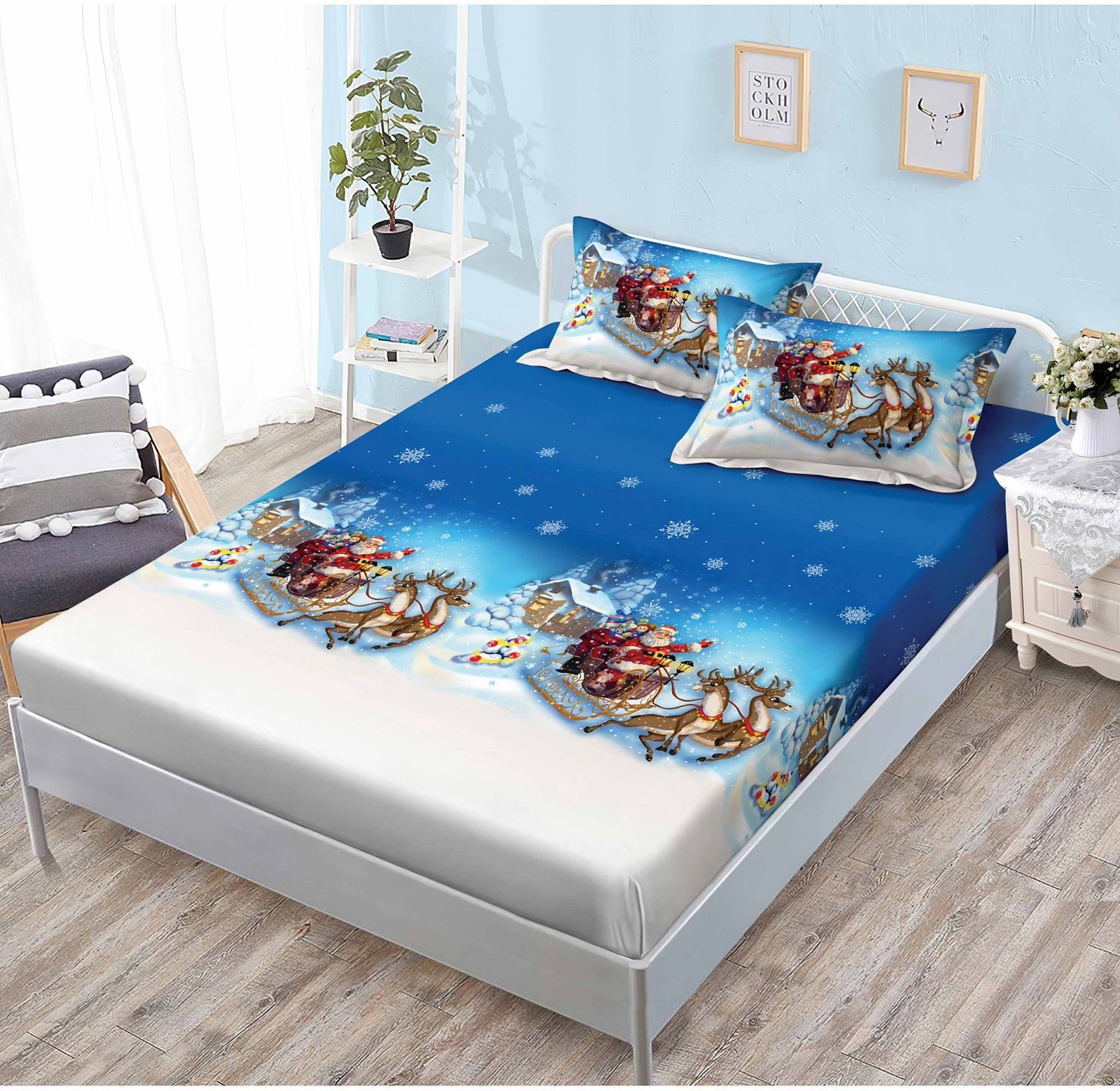 Коледен комплект спално бельо: Долен чаршаф с ластик и 2бр. калъфки – 3KL015